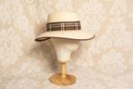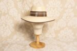 Sombrero Fedora de ala ancha en lana merino impermeable. Color crudo con cinta de cuadros marrones, ideal para dar estilo y presencia.