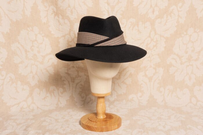 Sombrero Fedora de ala ancha en lana merino impermeable. Color gris con cinta en contraste burdeos, ideal para dar estilo y presencia.