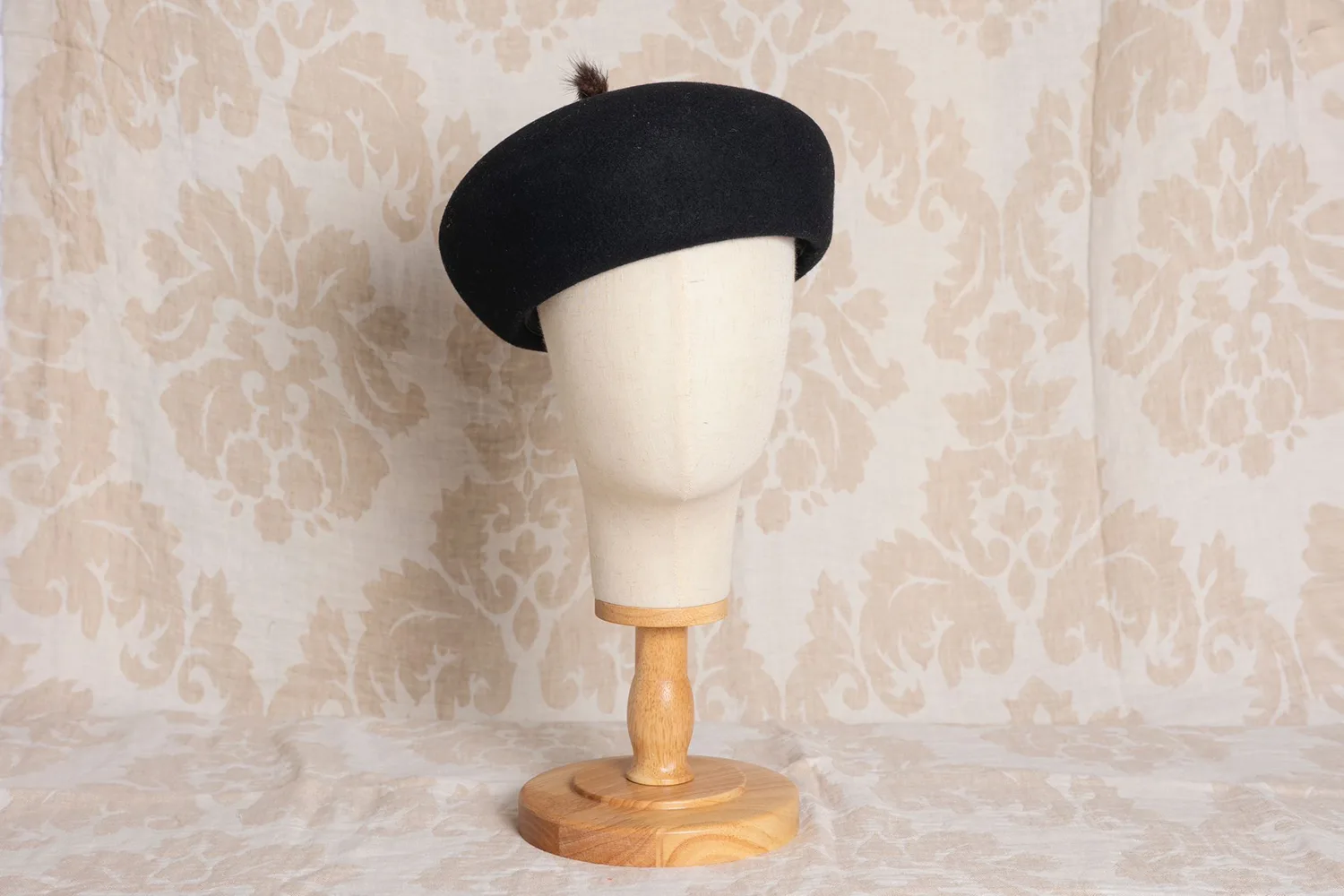 Casquete negro de lana merino con pompón desmontable. Un diseño elegante, impermeable y versátil, ideal para looks de diario o eventos especiales.
