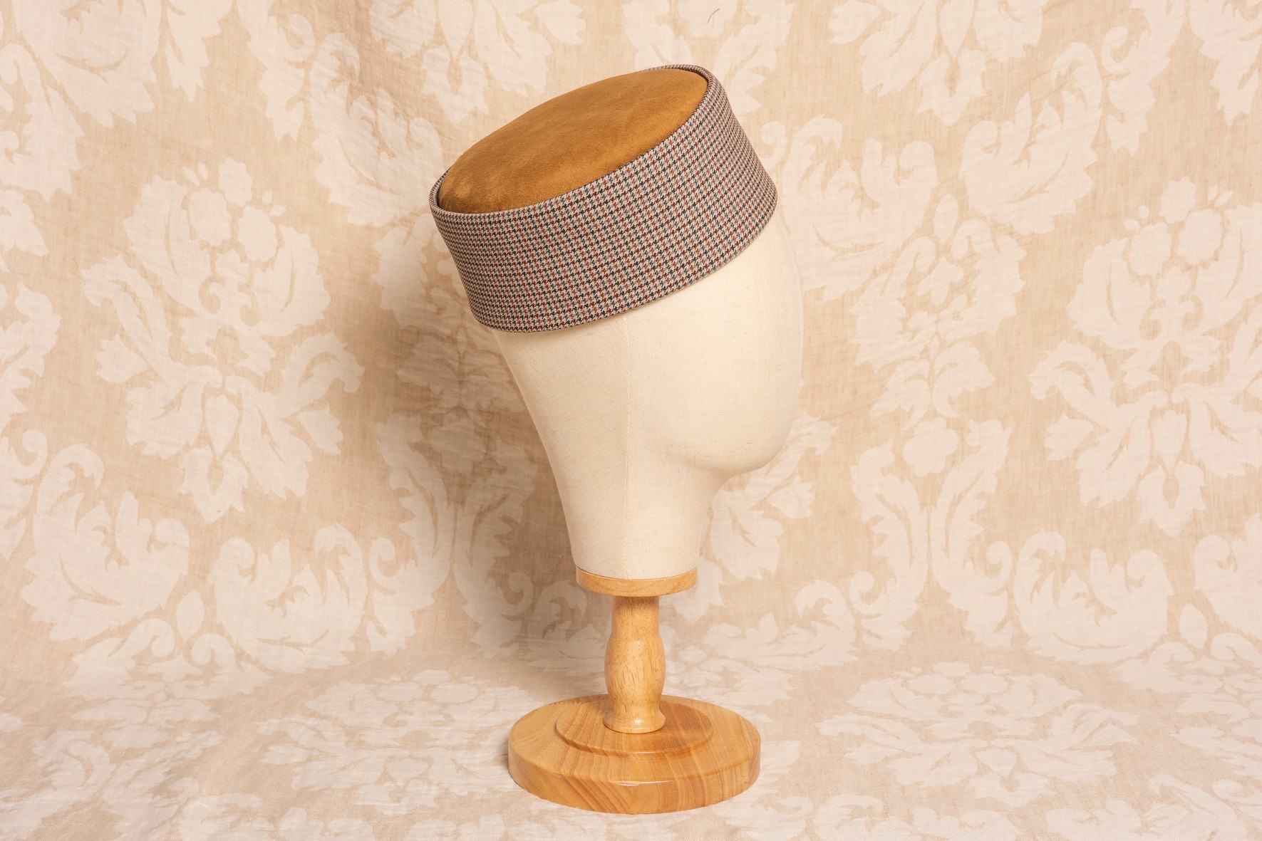 El Casquete pata de gallo con Terciopelo camel es un accesorio único pensado para mujeres que desean marcar estilo con un aire de distinción. Con una copa de 8 cm y un diseño cuidado hasta el mínimo detalle, este casquete combina la suavidad y elegancia del terciopelo en color crema con la fuerza del estampado pata de gallo, creando un contraste lleno de carácter y sofisticación.