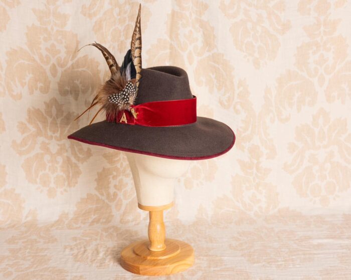 SOMBRERO ALA 9 topo terciopelo burdeos- plumas XXL