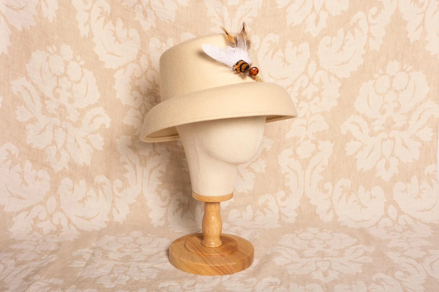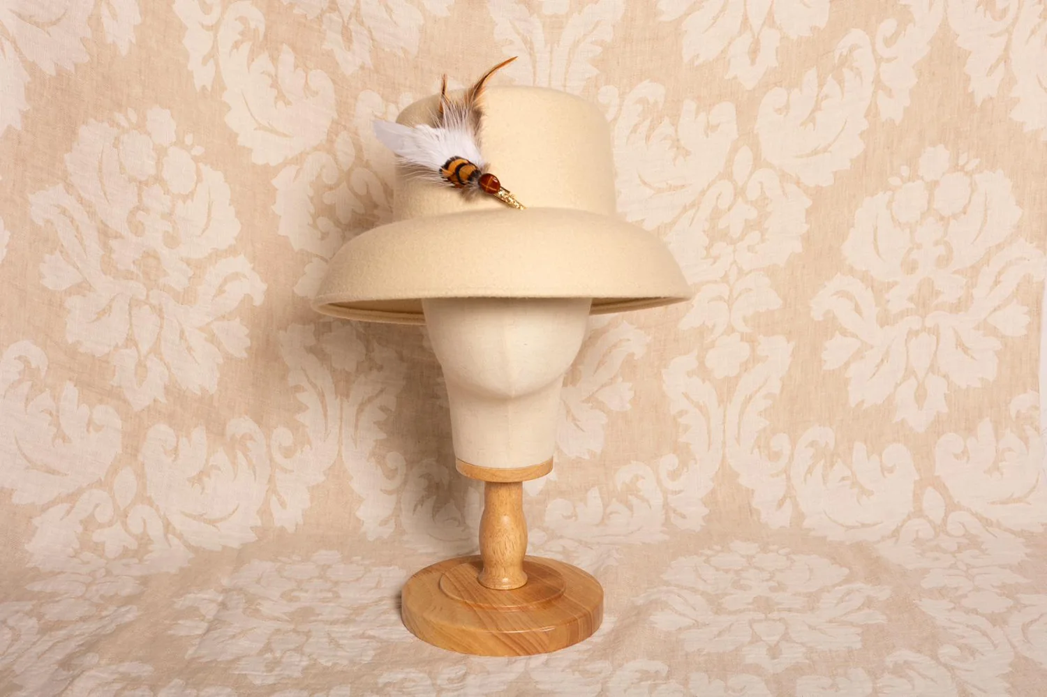 Sombrero bucket en lana merino 100% impermeable con diseño exclusivo en color crudo. Incluye plumas de quita y pon para un estilo versátil y sofisticado.