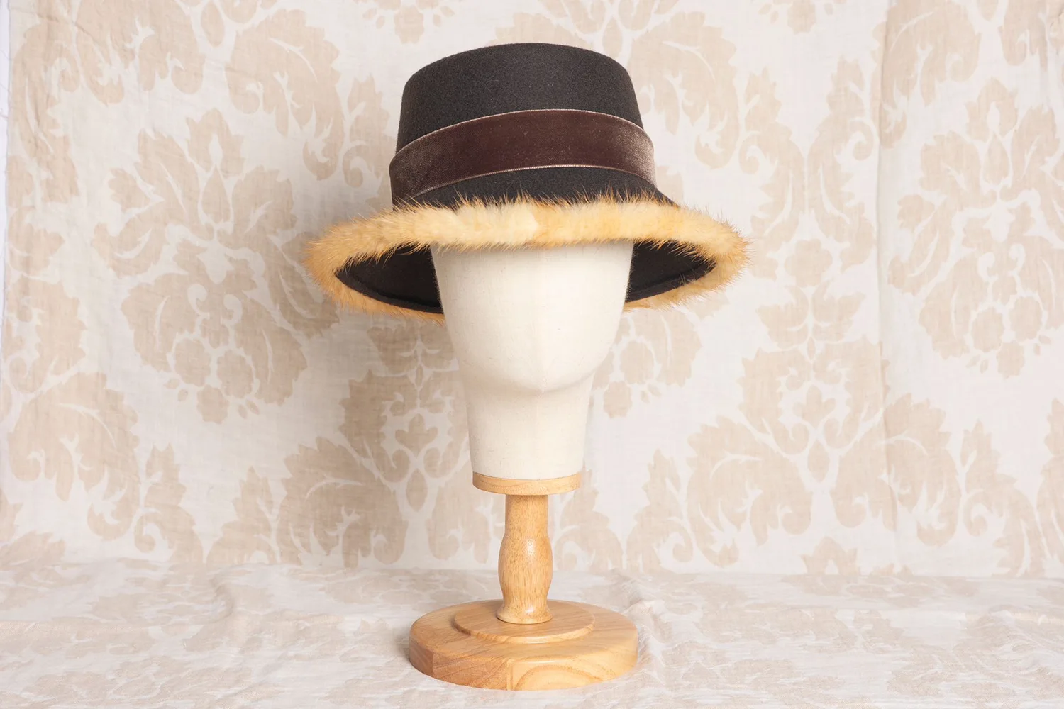 Con su copa de 12 cm y ala de 6 cm, este sombrero ofrece una silueta equilibrada y moderna. Su tono marrón profundo se realza con el ribete en visón, un detalle sofisticado que aporta calidez y exclusividad. La textura suave y la calidad de los materiales aseguran durabilidad y confort, incluso en los días más fríos o húmedos.