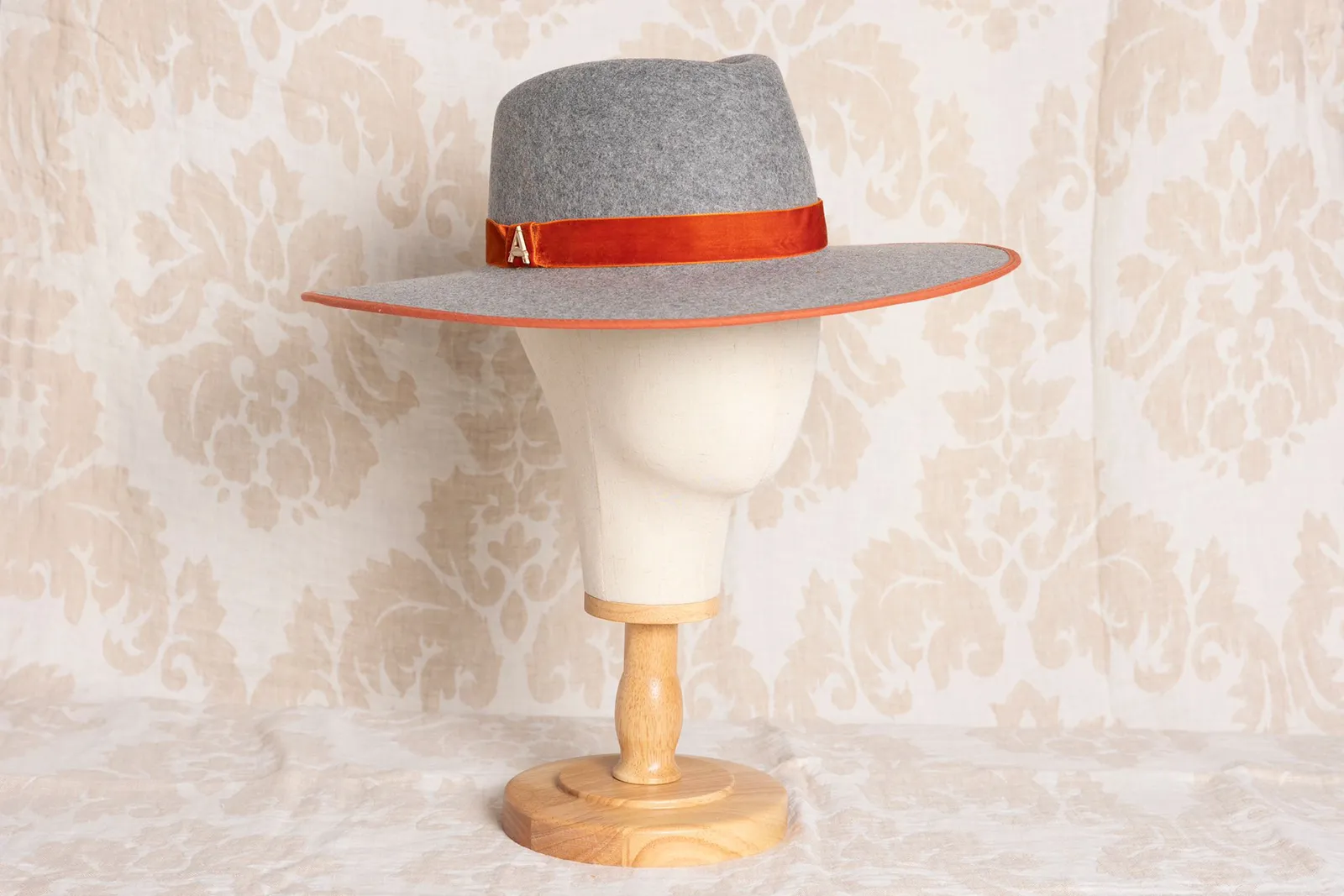 Su copa de 12 cm aporta estructura y personalidad, mientras que el ala ancha de 10 cm ofrece un aire sofisticado y favorecedor. El tono gris, sobrio y versátil, se complementa con una cinta en contraste en un elegante burdeos-anaranjado que aporta un toque de modernidad y exclusividad.