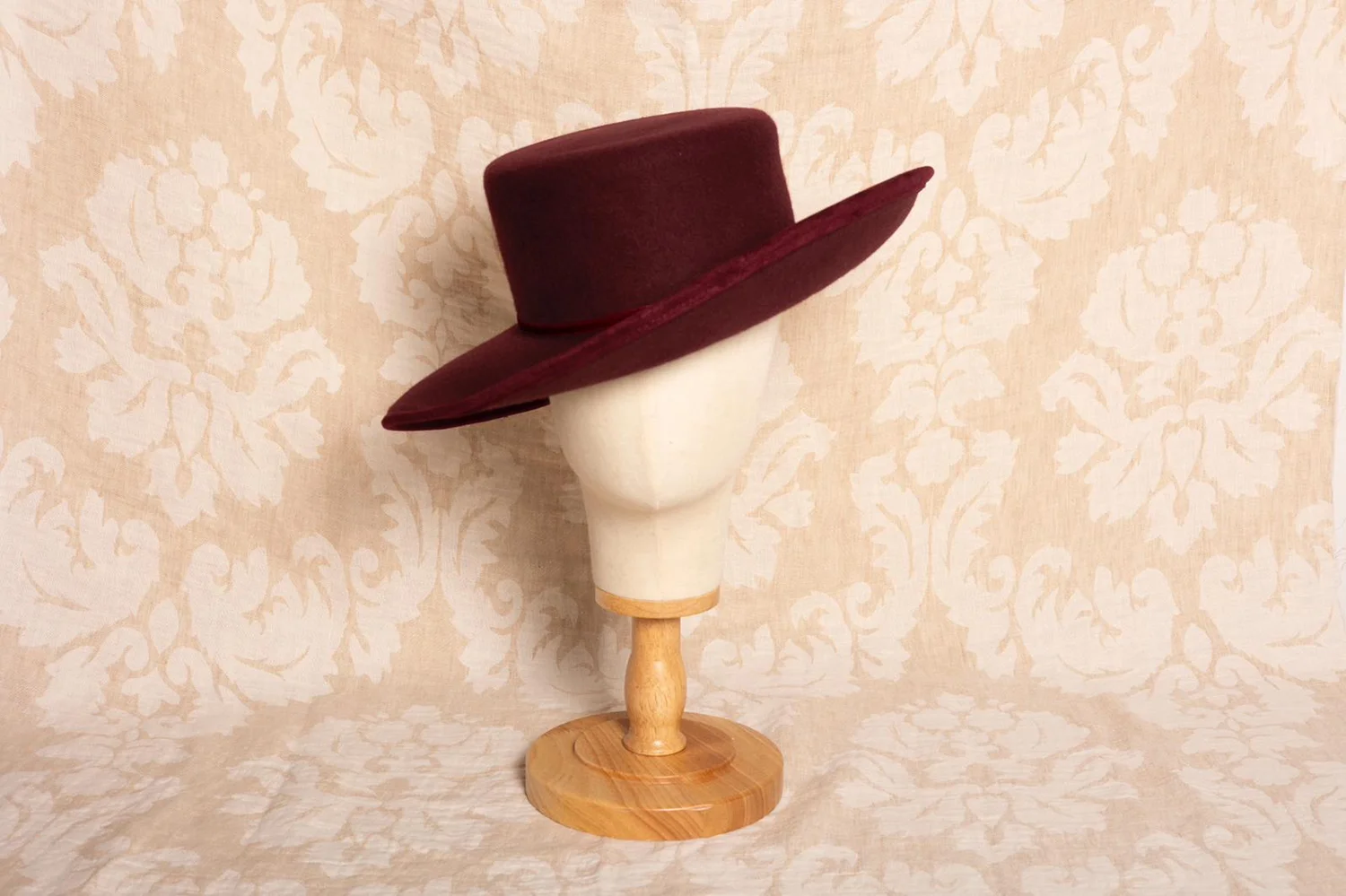 Un sombrero exclusivo de lana merino 100% impermeable en tono burdeos, con diseño asimétrico que realza la elegancia y el estilo sofisticado de cualquier look.