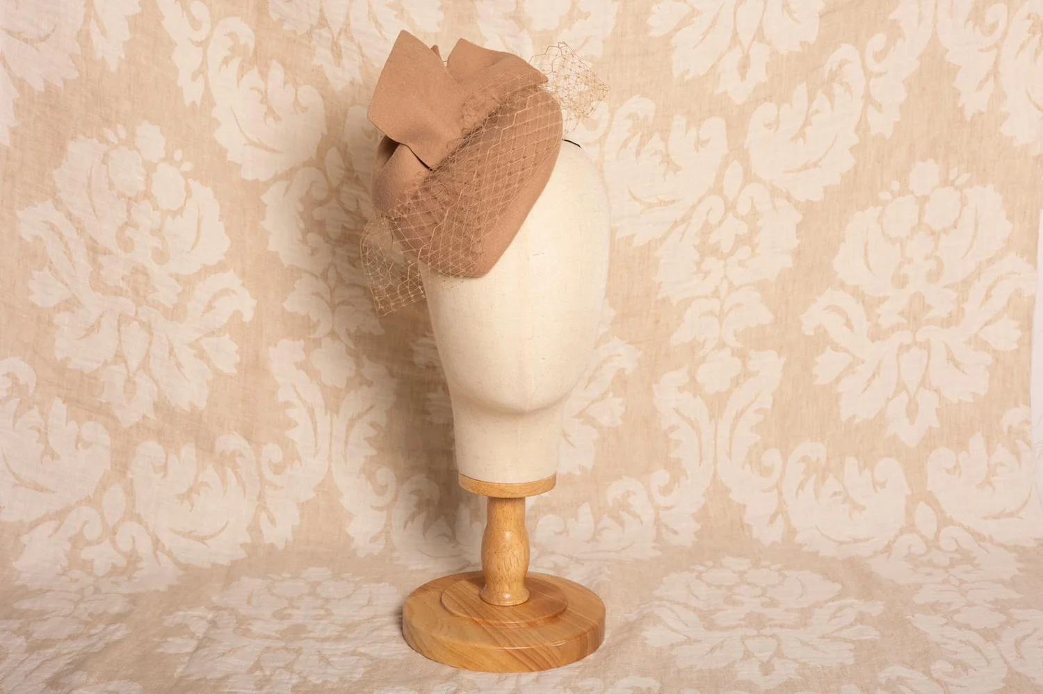 Su tono camel aporta calidez y versatilidad, combinando a la perfección con una amplia paleta de colores. El diseño cuenta con una fina redecilla y un lazo estructurado que enmarcan el rostro con elegancia, aportando ese toque de glamour propio de los tocados ingleses de alta costura.